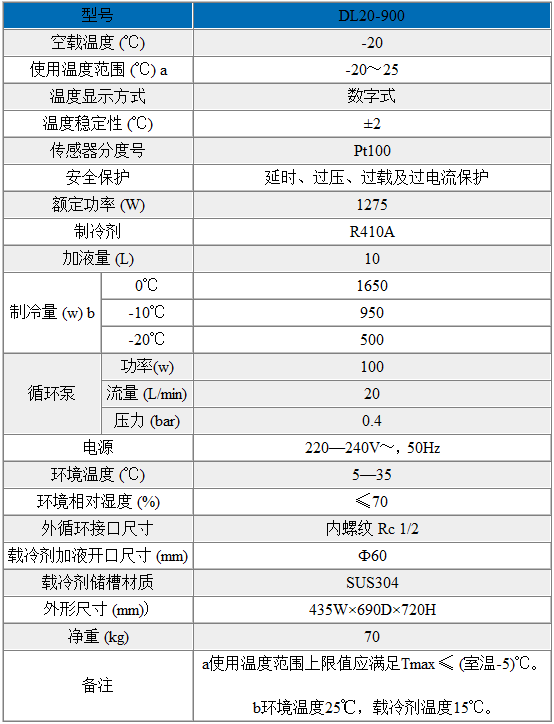 DL20-900循環(huán)水冷卻器溫度范圍在-20℃~25℃,是一種采用符合標(biāo)準(zhǔn)的制冷劑,智能控制壓縮機(jī)超負(fù)荷、過電流運(yùn)轉(zhuǎn),保護(hù)壓縮機(jī),密閉式循環(huán),保護(hù)載冷劑揮發(fā),適用于需要維持低溫條件下的檢測,化學(xué)、生物、物理實(shí)驗(yàn)??捎糜卺t(yī)藥衛(wèi)生、食品加工、化工、及大專院校、科研所實(shí)驗(yàn)室。